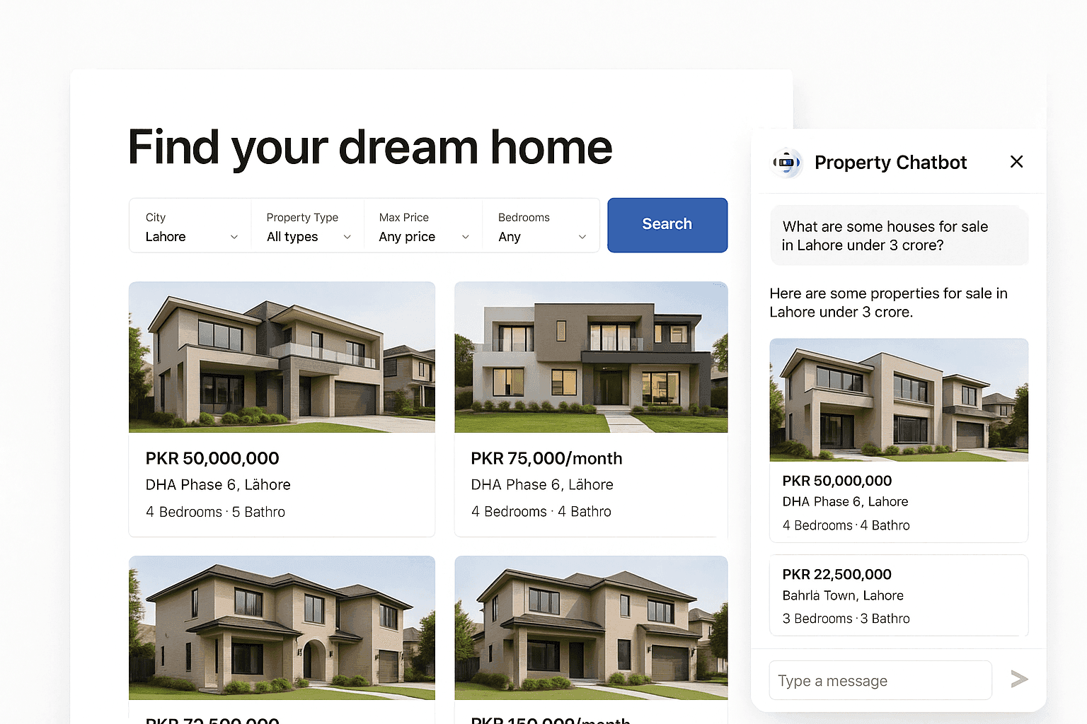 A custom real-estate chatbot for Graana — users ask property questions, the bot replies and shows matching results in-chat.